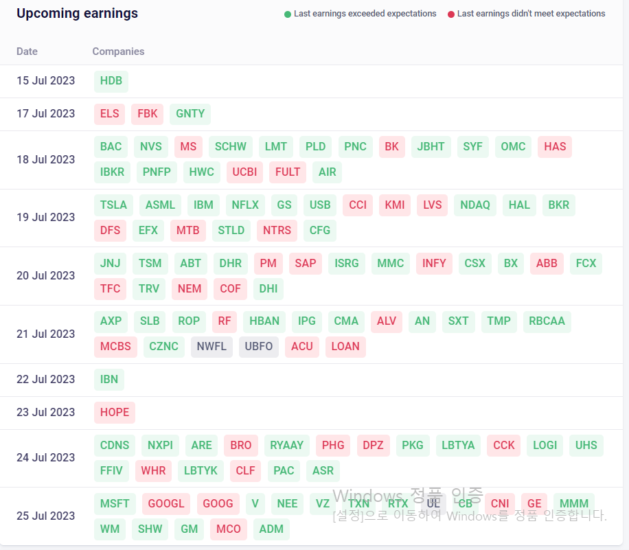 눈에 띄는 주요기업들: 07/19: TSLA, ASML, IBM, NFLX... 7/20: JNJ, TSM... 7/25: MSFT, GOOGL, GOOG, V, VZ, GM...