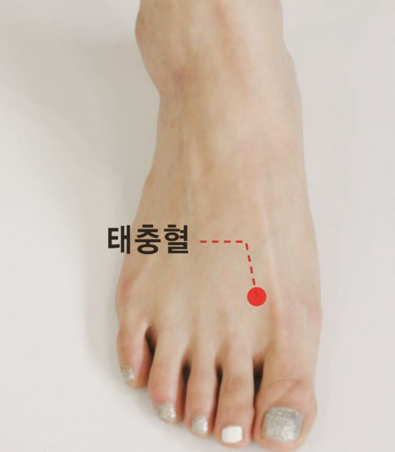 - 위치: 발등에서 엄지발가락과 검지발가락 사이를 따라 올라가다 보면 움푹 들어가는 곳이 있습니다. 이 움푹 들어간 곳에서 위로 약 2cm 정도 올라간 지점입니다.
